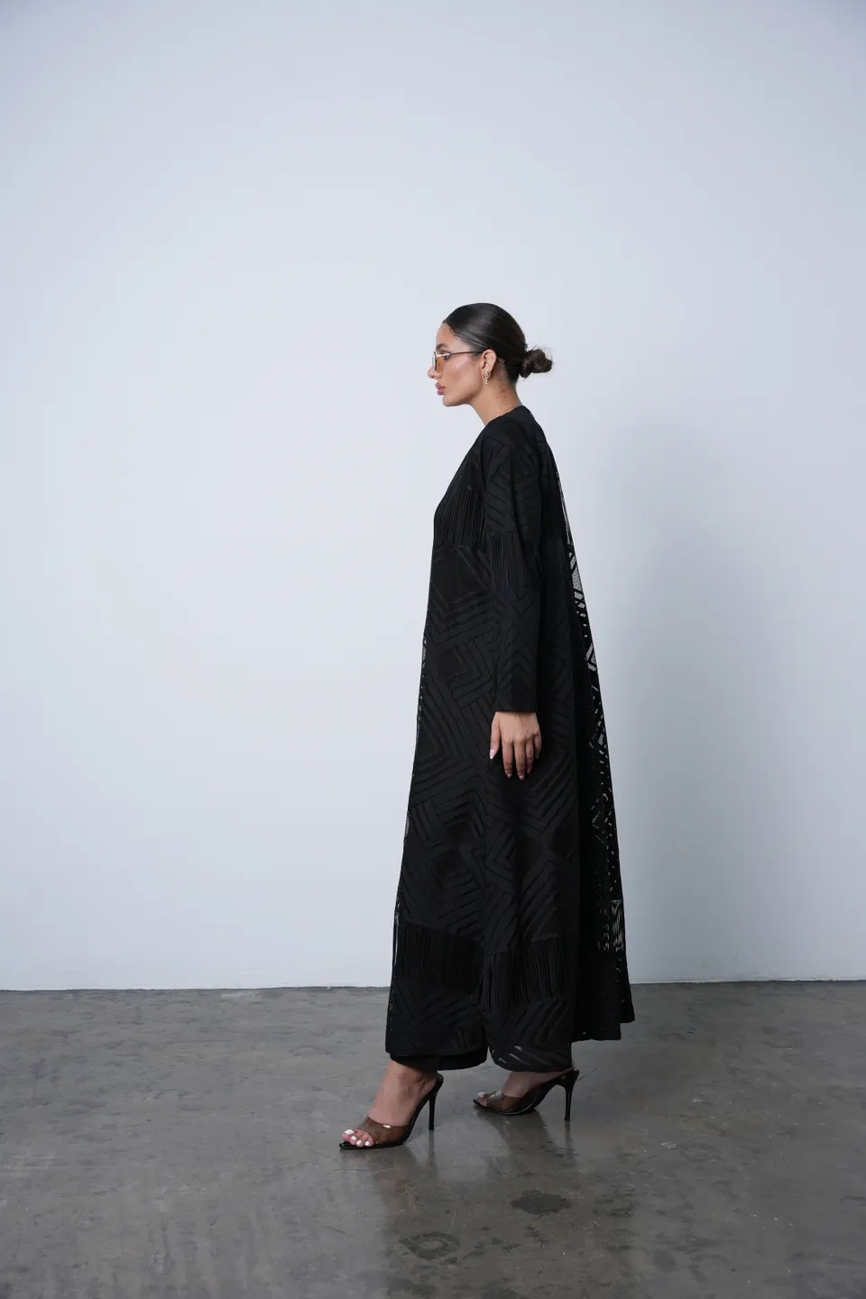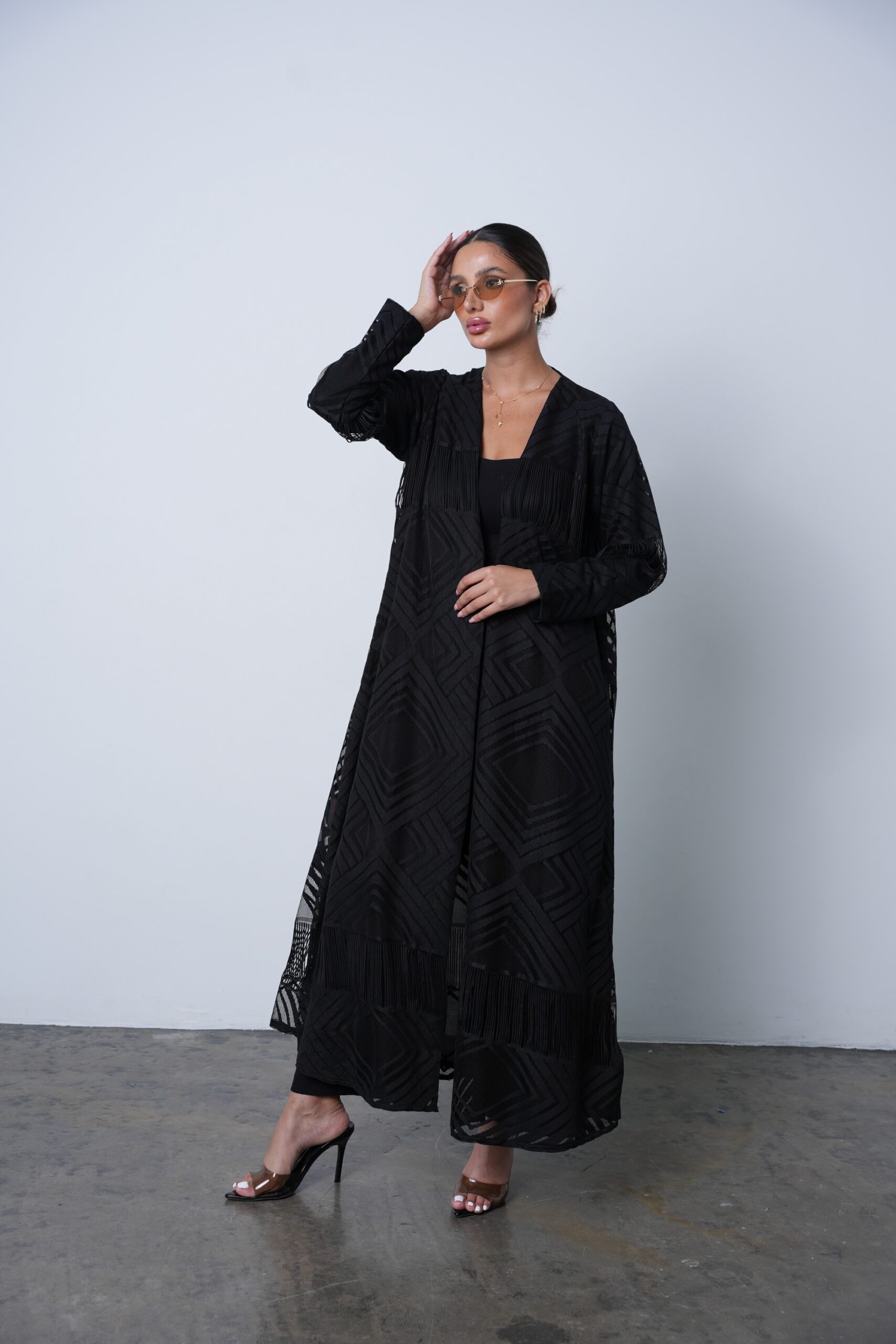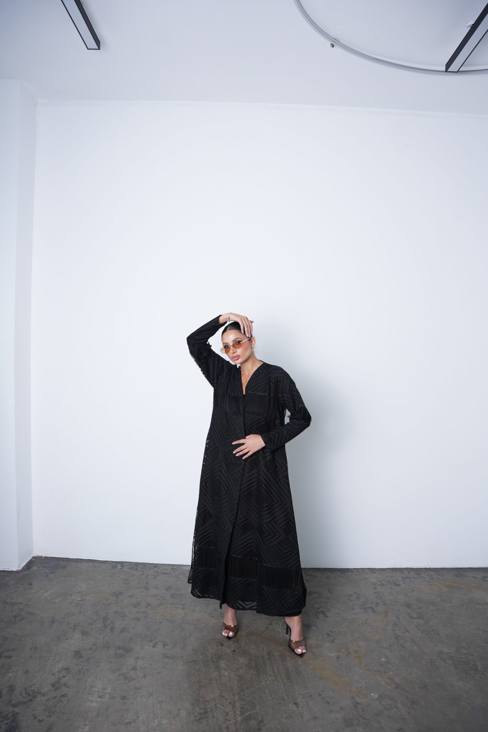 A straight-cut abaya with a refined high-neck collar, elegantly designed with subtle black line detailing that adds modern sophistication to its timeless silhouette.