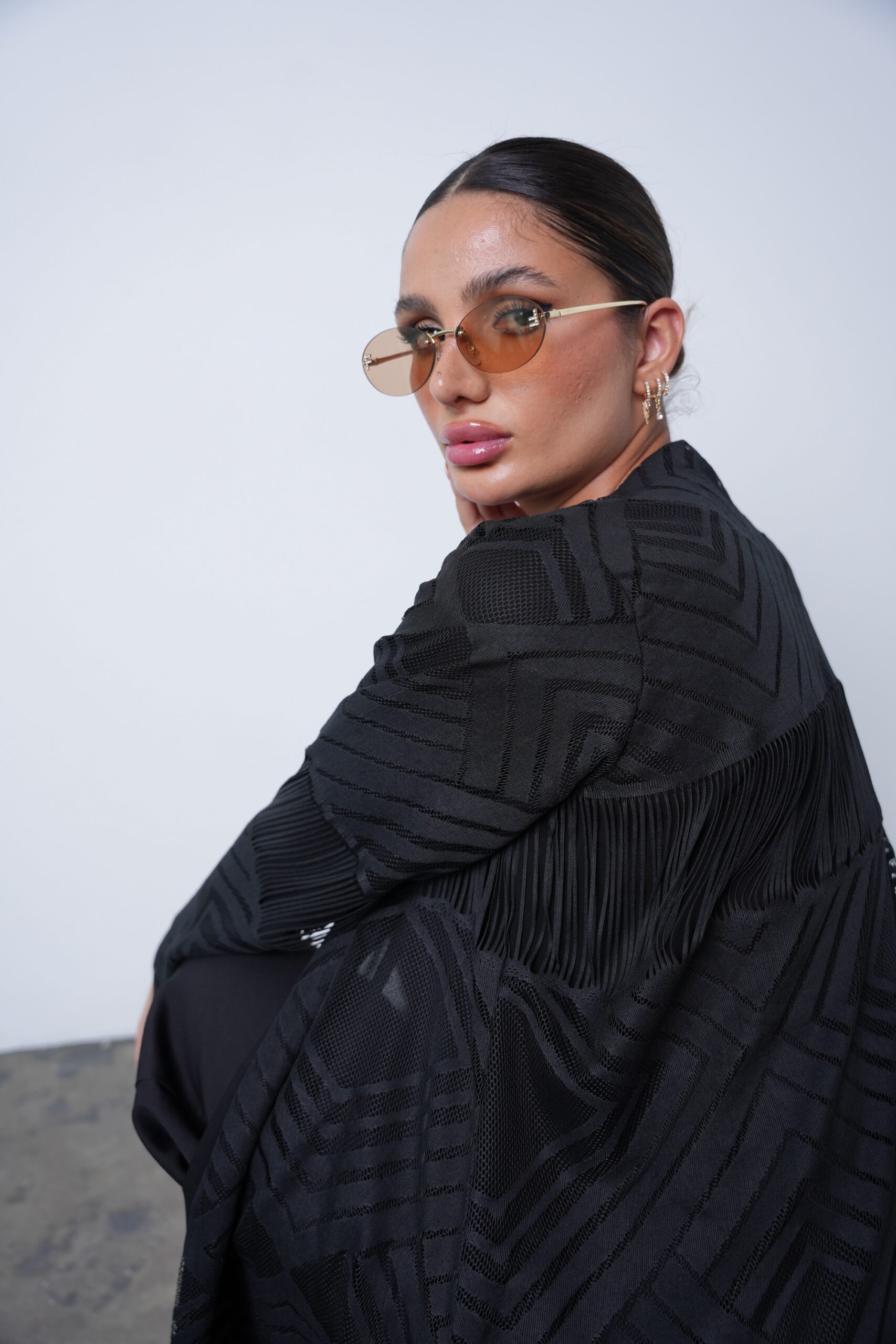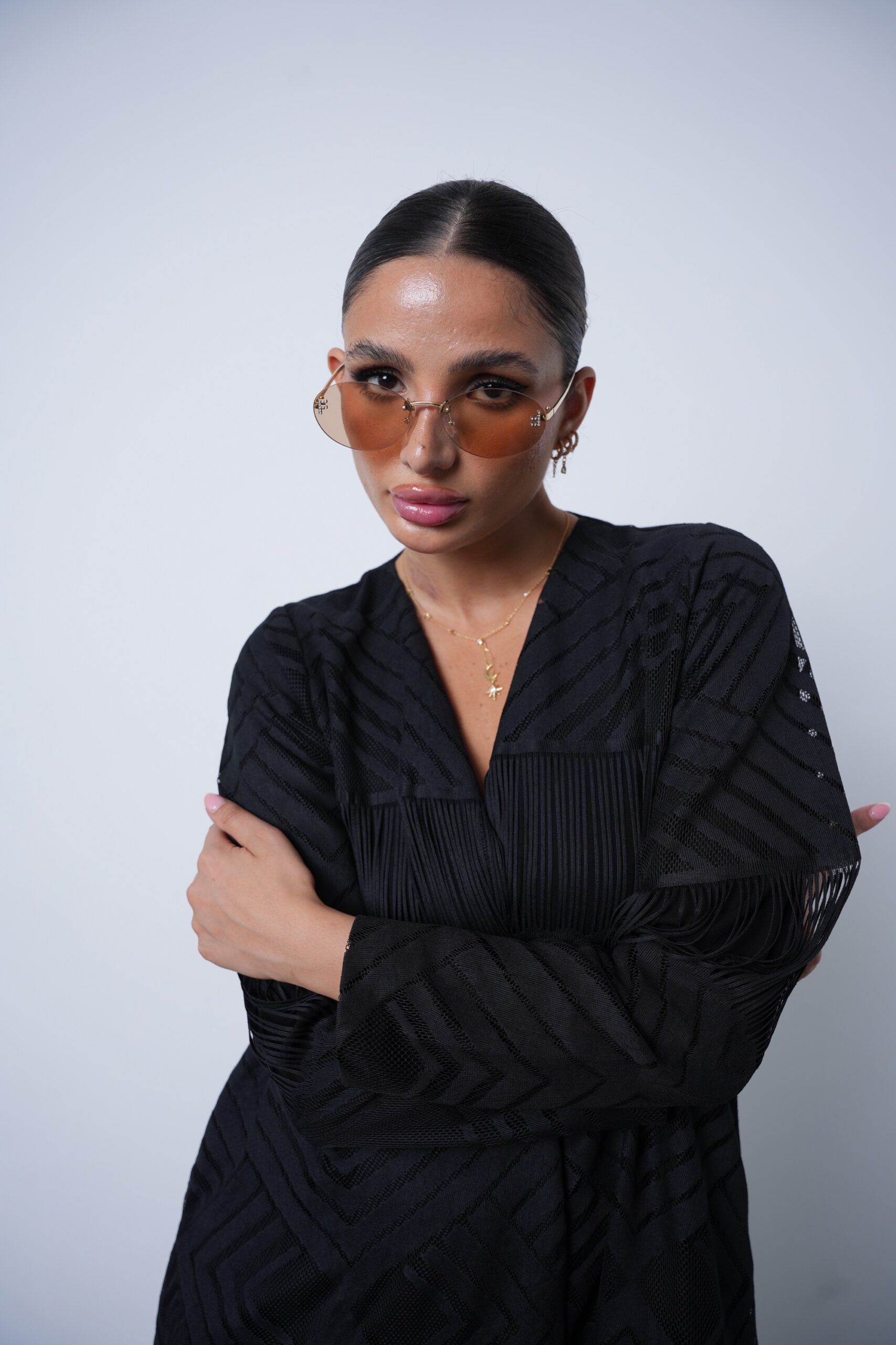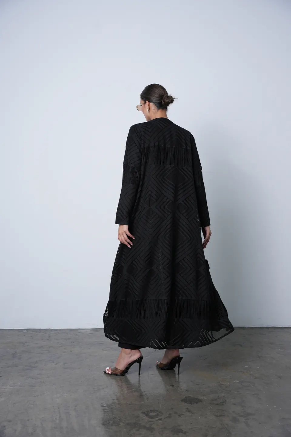 A straight-cut abaya with a refined high-neck collar, elegantly designed with subtle black line detailing that adds modern sophistication to its timeless silhouette.